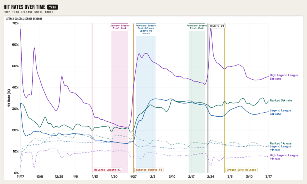 Le graphique ci-dessous montre les taux globaux de 3★ et 1★ de la sortie de l’HDV 18 à aujourd’hui à travers le mode Classé, la Ligue Légende et la Ligue Légende de haut niveau (5400+ trophées), avec les mises à jour majeures et les périodes clés de la Ligue Légende mises en évidence.